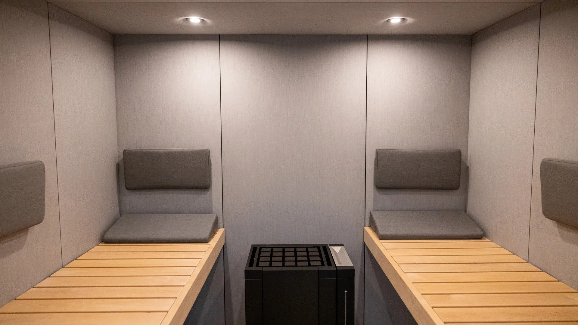 The functional fabrics used in the sauna are designed to offer superior hygiene and are easier to clean compared to traditional wood. Generally, a simple wipe-down with a damp cloth, similar to cleaning furniture, is sufficient. The technical acrylic fibers are water-repellent and do not absorb bacteria or odors. In the unlikely event of a staun, we recommend using a mild soap solution and a cleaning cloth for effective removal.